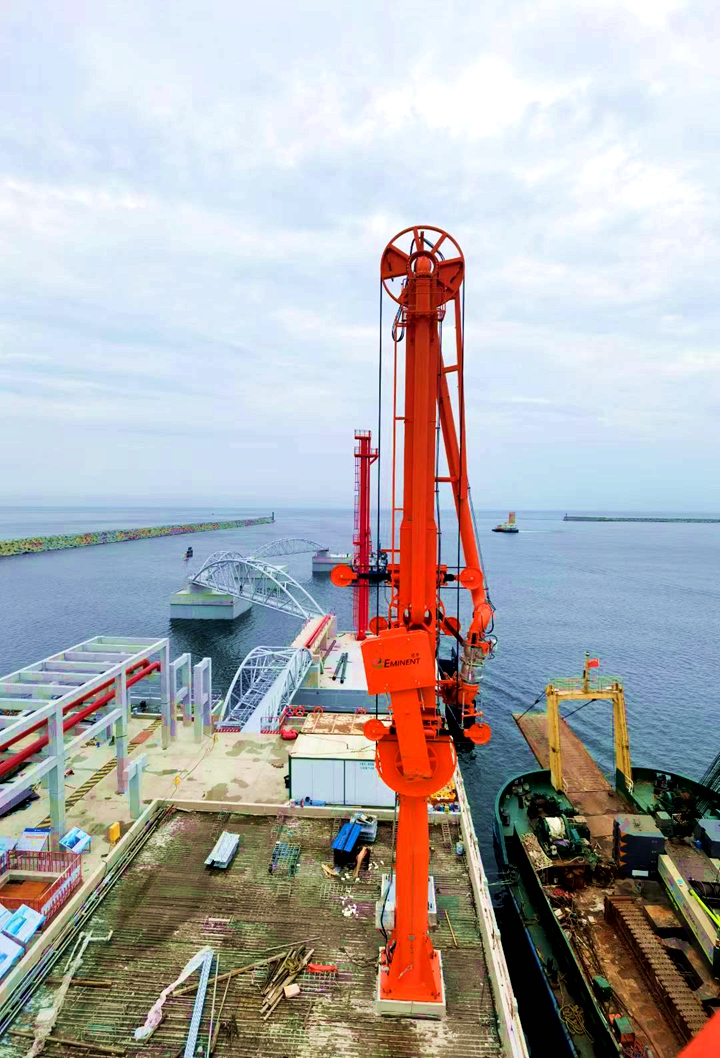 此次安裝的4臺(tái)裝卸臂堪稱碼頭“大動(dòng)脈”,每臺(tái)高23.3米、重41.83噸,采用電/液驅(qū)動(dòng)技術(shù),具備高效、安全、穩(wěn)定的輸油能力,全部投用后,每年可助力完成1650萬(wàn)噸原油輸送任務(wù),將大幅提升茂名港原油接卸與中轉(zhuǎn)效率。同步安裝的具有浮動(dòng)功能的登船梯高26.5米、重約32噸,根據(jù)潮汐自動(dòng)調(diào)節(jié)梯高度的智能設(shè)計(jì),為10萬(wàn)到30萬(wàn)噸級(jí)的船舶提供了安全便捷的通道;2座高29米的消防炮塔上的消防水炮最大覆蓋半徑達(dá)99米,其射程遠(yuǎn)、流量大,如同“安全衛(wèi)士”構(gòu)筑起碼頭前沿的安全保障網(wǎng)。